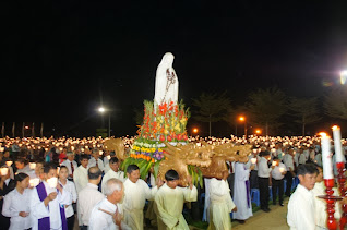 Đoàn rước kiệu Đức Mẹ khởi đầu với nghi thức xông hương do cha GB Trần Văn Thuyết, Hạt trưởng Đức tánh, với nến sáng trên tay, Giới Gia Trưởng GP Phan Thiết và quý khách hành hương sốt sắng cung nghinh Đức Mẹ rước lên lễ đài.